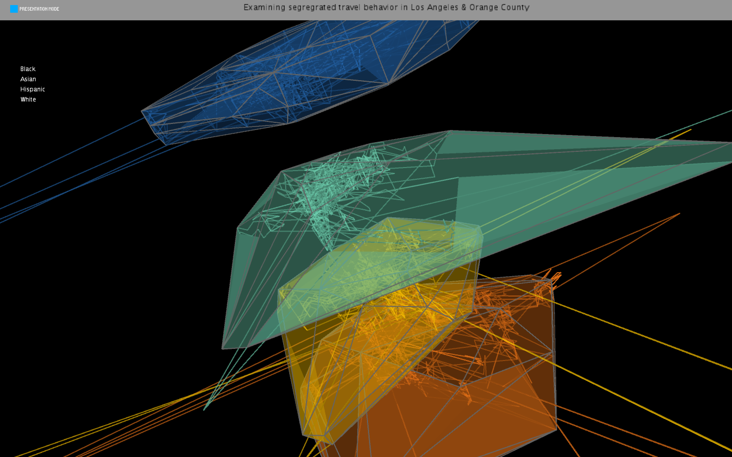 This project takes each person's travel activity, represented as connected lines, and puts them within a 3D layer of others with the same race.
