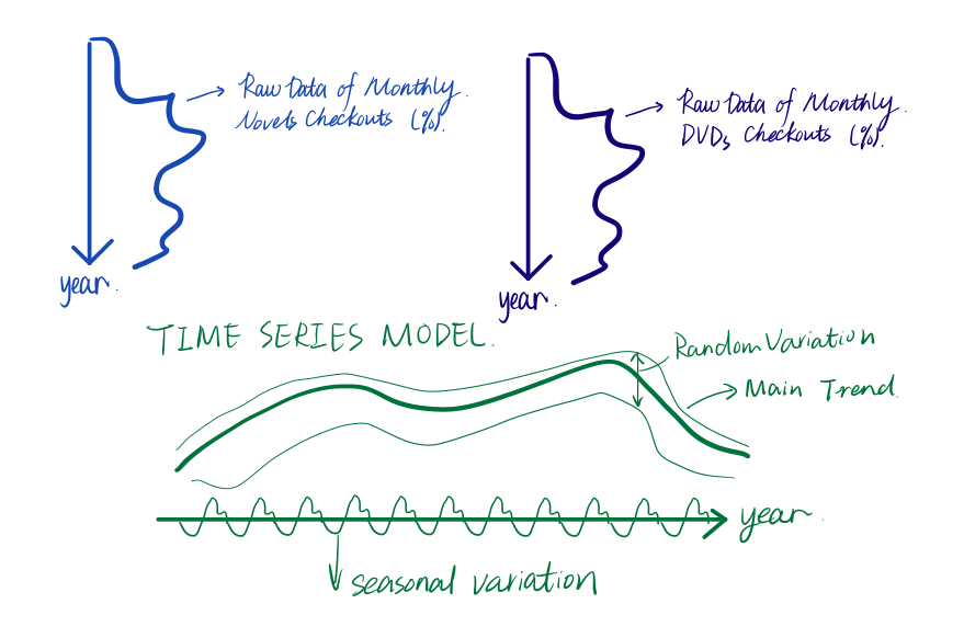 Monthly checkouts percent of the novels related to A Song of the ice and fire were calculated. The same pre-processing procedure were done for the DVDs of the HBO TV series counterparts. I calculated the monthly percentage instead of using raw checkouts because according to project 1, my classmates also found similar trends of checkouts regarding to other items. Thus, I would like to control the total checkouts to exclude the factor that people might not borrow items too frequently these years in general. Then, the monthly percentages were input into Rstudio to develop two time series models for the novels and the DVDs separately.
