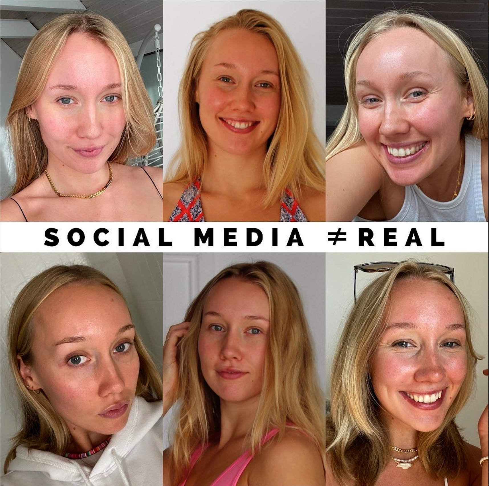 In these pictures, we see a good looking girl as is commonly presented on social media. We can see some makeup and maybe some slight editing? But this woman has an even skin tone, no pores, good hair, and bright eyes. When these images are posted on social media under the guise of no editing, it makes women (and people in general for that matter) believe that women can look like this naturally. But the truth is far from that.