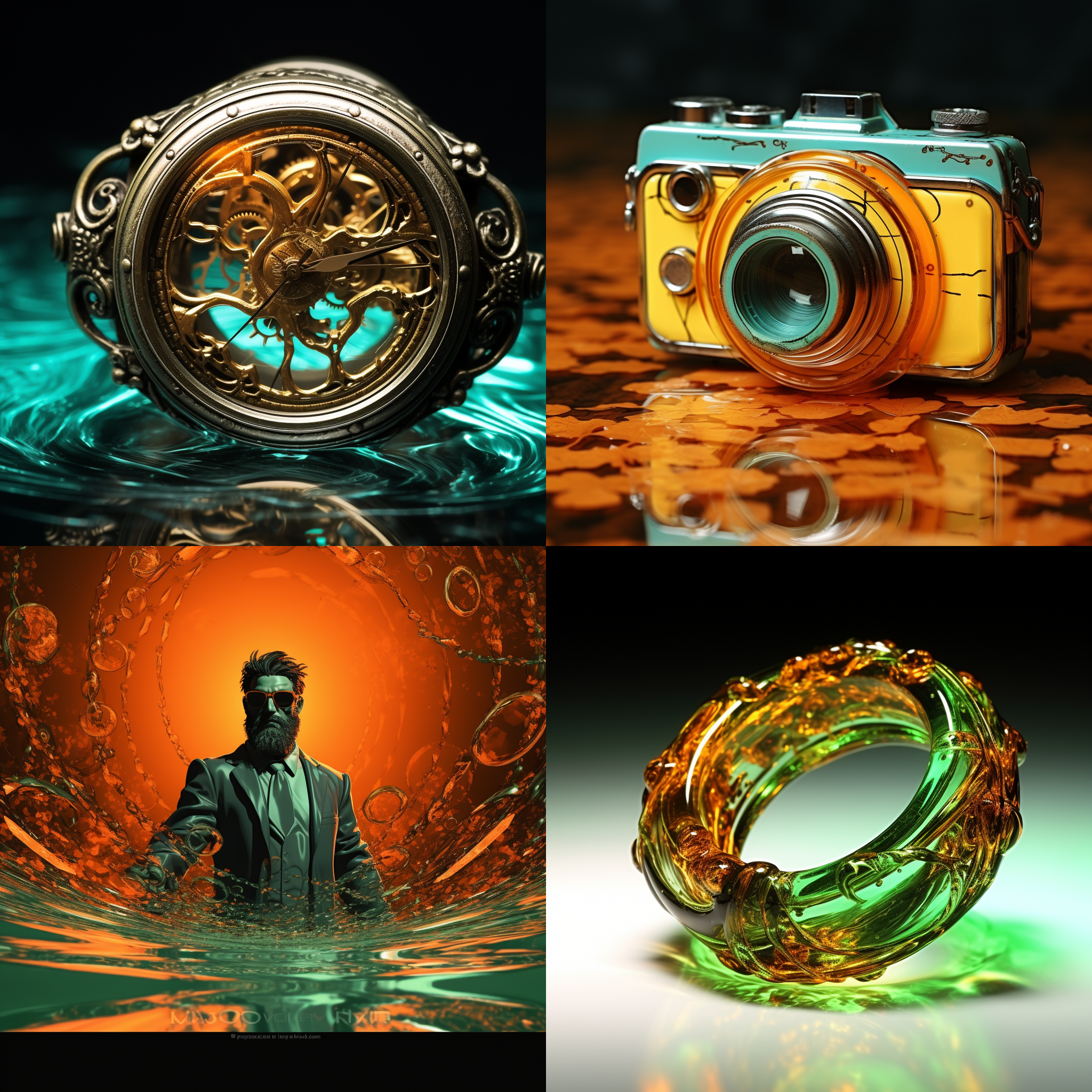 Series 3: Prompt: https://s.mj.run/Vzzd2t8XRLg , https://s.mj.run/wAXvN30npBA , https://s.mj.run/2Lk5njr3Sog --style raw --s 250 Without any text input, the bot once again made advertisements. I am not sure if the placement of the green rings in one of the images has anything to do with why it made more product ads, but this time it didn't use the city as a background. It barely used the orange forest's original concept at all at a glance. The forest was turned into the orange copper in the items, as well as produced the leaves in the first image, but the blue water was more prevalent, and it begs the question if the bot is much more biased toward blue than orange. I'm unhappy with the fact it produced more advertisements, and not a sort of forest with green and blue hues on top of the orange. It appears the bot is biased toward making advertisements, as that may be what the developers intend to market it as. A cheap way for companies to produce advertisements.