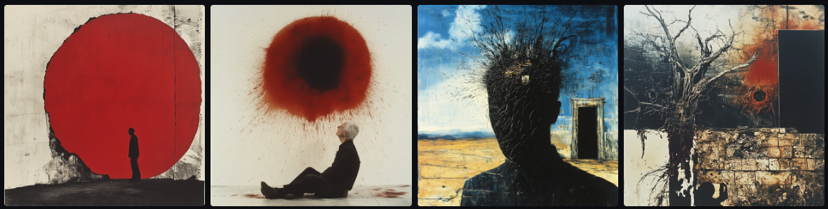 The whole process highlights the tension between control and unpredictability in generative art: while prompts are crafted intentionally and randomly, the AI understands the texts as the reader and recreates the images as the new author, introducing emergent elements that transcend authorial intent. And I am interpreting the resulting images with my own interpretations as the reader.