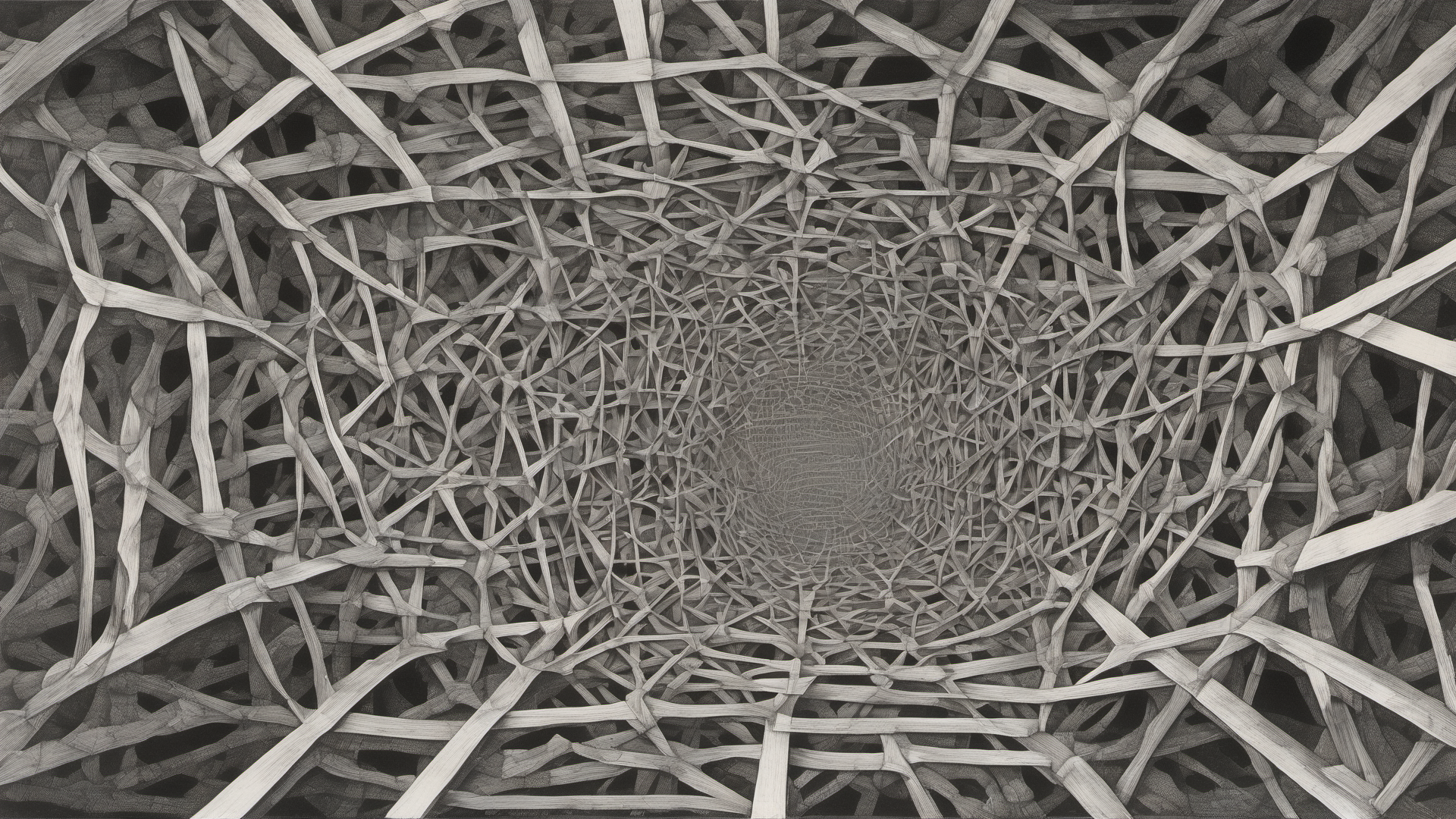 Then add ”Maurits Cornelis Escher” into prompts, the image is still more or less a web, in a visual style of Escher of black and white drawings. SD: The web of time. an infinite series of times, in a dizzily growing, ever spreading network of diverging, converging and parallel times. Maurits Cornelis Escher.