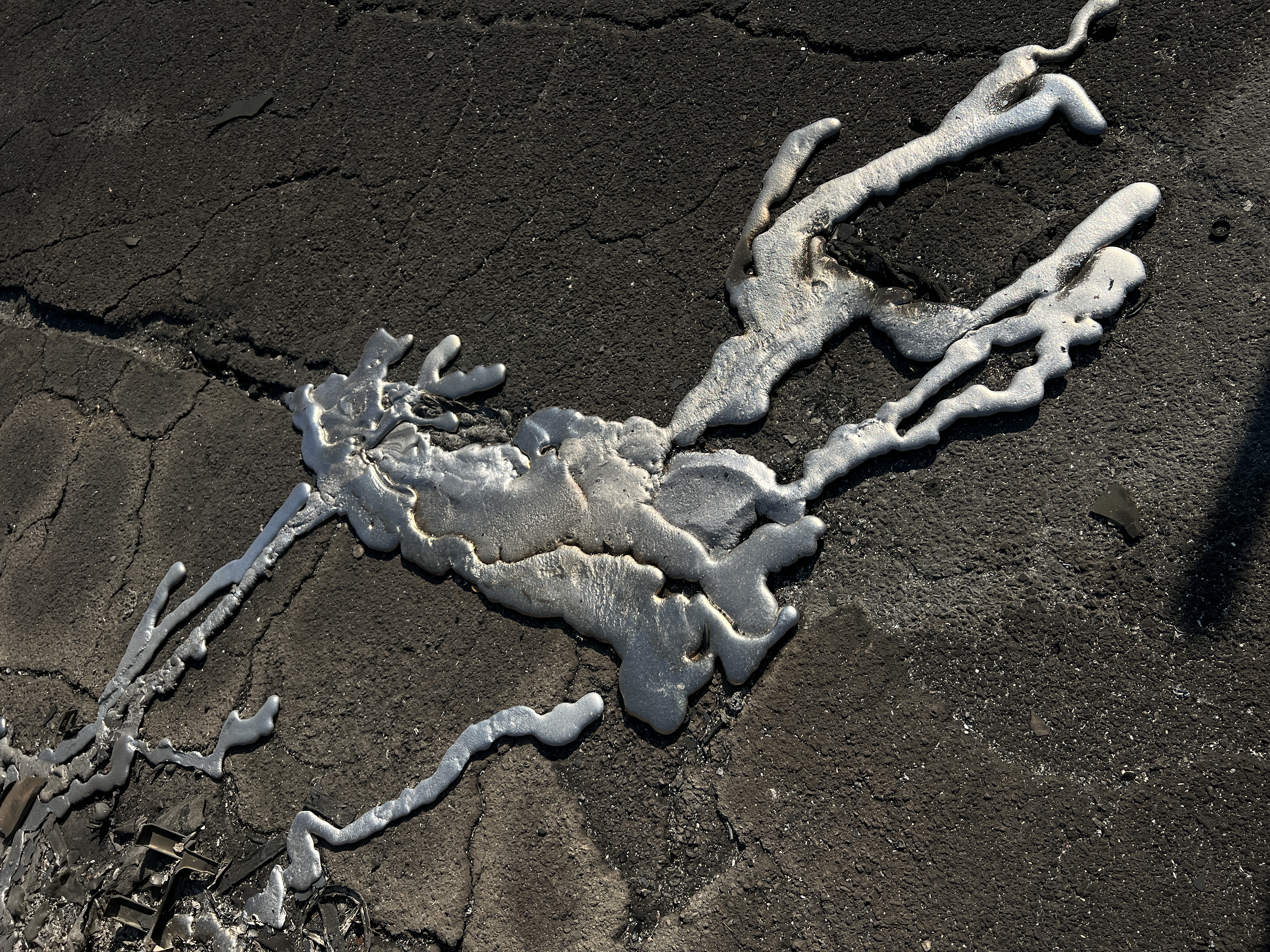 photograph of sunlit asphalt with a thin stream of cooled molten aluminum, irregular metallic puddles and drip trails following natural gravity flow, extremely realistic surface micro texture, harsh midday sunlight, documentary photography, natural imperfections, industrial accident residue, photorealistic, high dynamic range