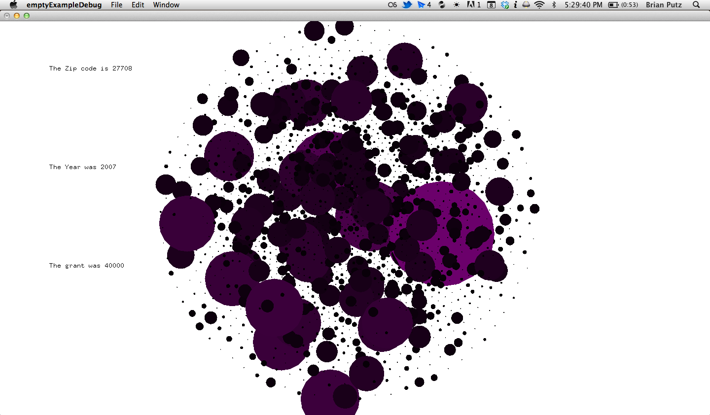 Each particle has both an attraction and a repulsion force that tracks the position of each particle. These forces working together cause an organic liquid like flow to the dynamics of the visualization. They attraction function is tied to the position of the mouse where the repulsion is focused on the size of each individual particles pushing them away from each other. With the XML data it was filled with a variety of information. The most important, in my opinion, were the location by zipCode as well as the data amounts and how many went where. I used the information of instances of grants being awarded. Initially it runs through the XML information and further into the application they are then mapped by zipCode.
