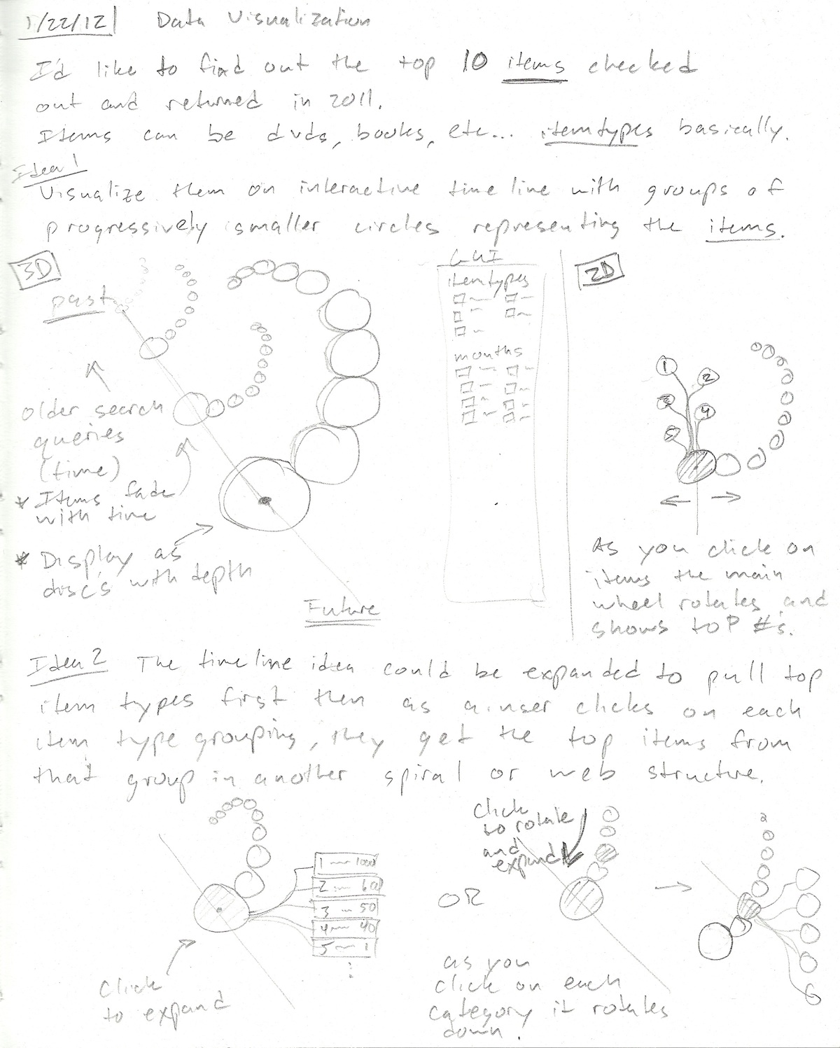 The goal of this project was to become familiar with writing an interesting query to determine the top 10 checked out DVD's of 2011. My idea as you can see from the sketches started out as an interactive timeline that allows the user to explore the top items of a specific itemtype over a time period. I ultimately simplified the project to show 10 items for 2011 to practice combining aesthetic elements with the data set.