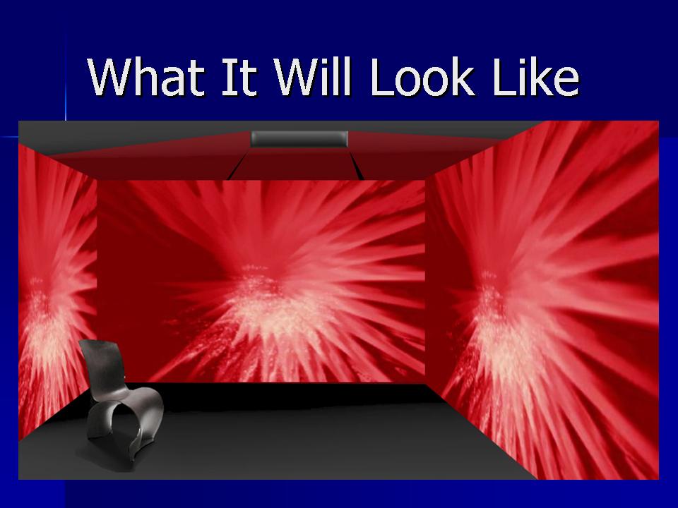 My project of The Emotional Room is a combination of detection of human emotion with music and pattern projected walls based on the audience’s emotion. With this kind of project, the audience experiences a private room that combines visual and audio performance that is created specially and personally only for him/her. Below is an image showing what the room will look like as the system works. Detailed project proposal is attached below: Because the PPT file cannot be uploaded, my powerpoints will be posted in image form below: