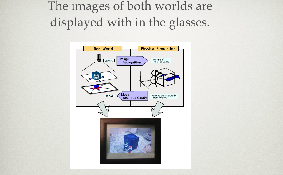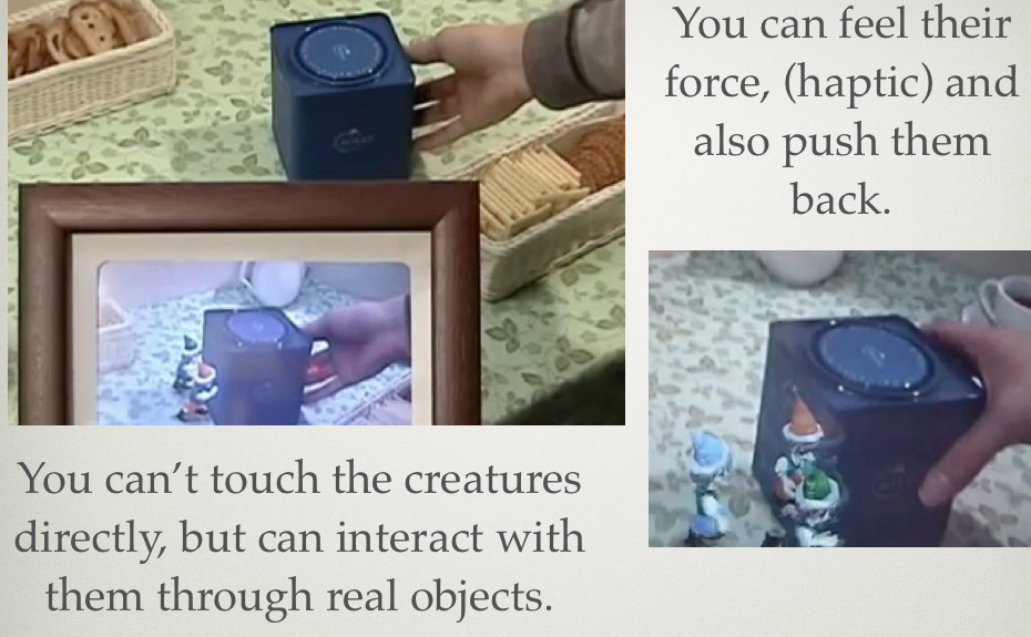 How the interaction takes place is through the real world objects. If you were to push the box, you can feel the force of the imaginary creatures. (haptic technology)