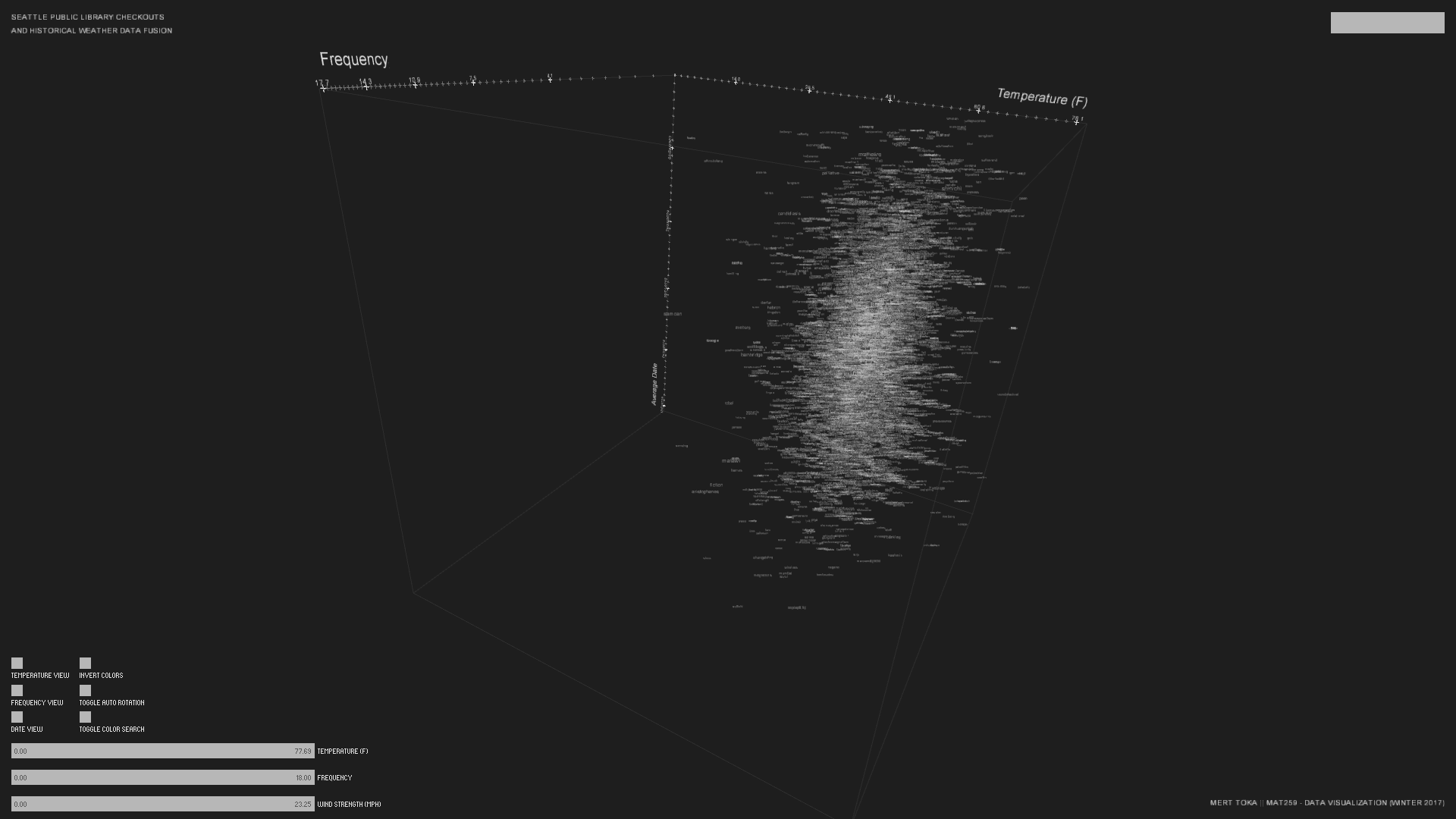 csvwriter.writerow([theArray[x].datetime, theArray[x].count, theArray[x].subjects])Whenever the user starts to type something with the keyboard, the system will search the phrase inside of the keywords (Regex is allowed: http://regexr.com). On the right-hand side of the GUI, the search results are listed, and on the left side, the first word of the list is detailed. Also in the word cloud, search results are highlighted. The Time Barcode shape at the detail panel denotes usage dates of the current word, and the red line corresponds to its Average Date. Time barcode starts from the beginning of the data on its left (2005 April) and goes up to January 2017. In addition to these, it is possible to filter what's drawn inside the cube with sliders at the bottom-left. The left-most buttons focus the camera to a specific axis. Invert Colors option changes the color scheme from dark to light. Auto Rotation rotates the camera automatically, and Color Search option paints the words that are the result of the current search term in terms of their average temperature values. After using the visualization, a couple of minutes later I discovered that it shows a pattern on low-frequency items. Since these items only appear once in the dataset, their average temperature is the temperature they are used in. Since this is the case, Date-Temperature plane clearly shows seasonality (winter-summer differences in terms of temperature). The source code (requires PeasyCam and ControlP5 libraries) is below: