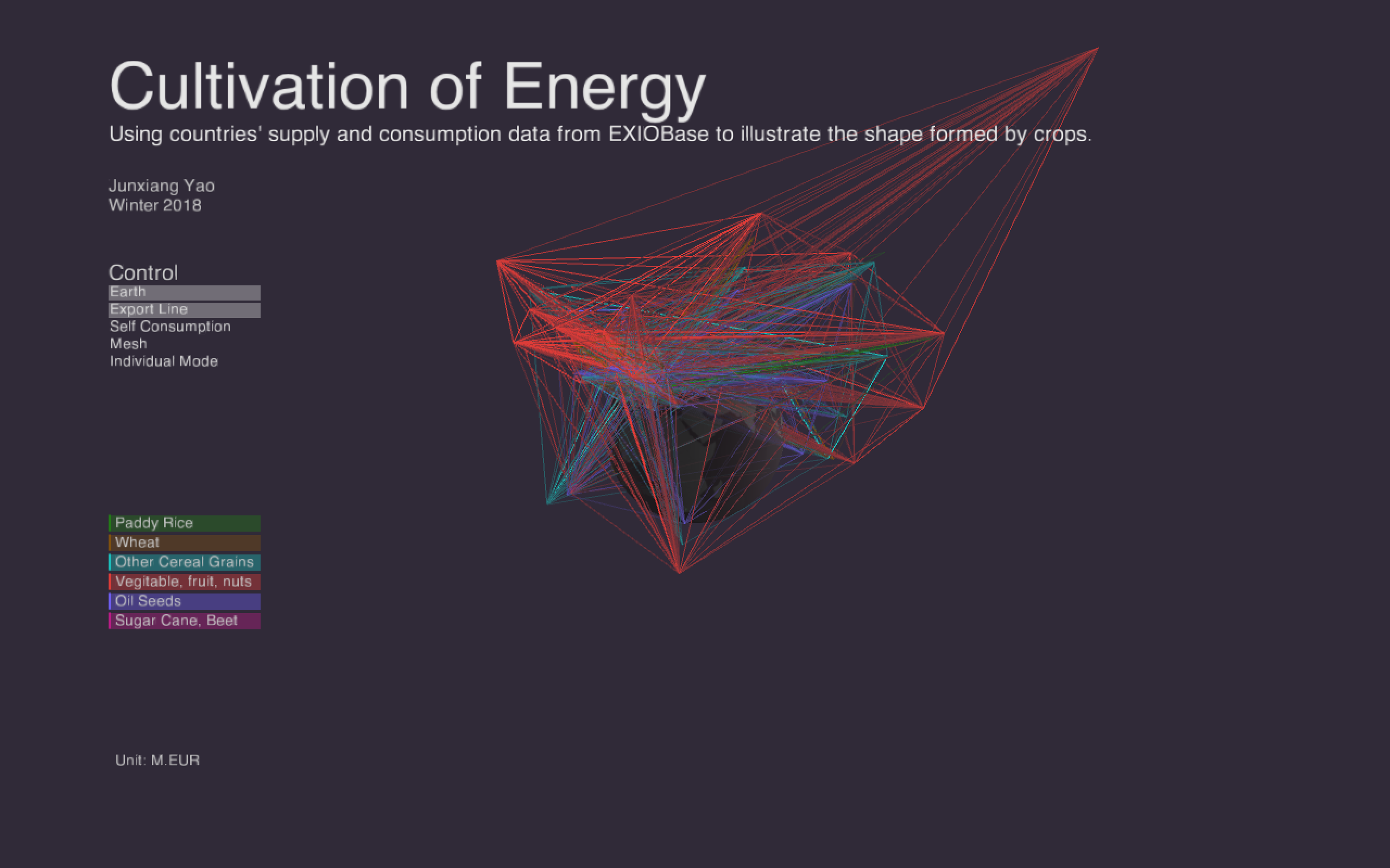 If a country consumed certain kind of crop from another country, there will be a line drawn between the two points.The brightness of the line shows the amount of international consumption between this two country. And when displaying all the data, a net was formed consisted of all the lines.