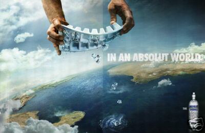 The advertisement reads “in an absolut world”. It combines the name of the alcoholic beverage with a well known phrase making it seem like in a perfect world someone would want it to rain vodka (their vodka). The use of the word absolut instead of absolute allows for the audience to assume that the ice trays are filled with vodka ice cubes, even though alcohol doesn’t freeze, our mind lets us forget that.