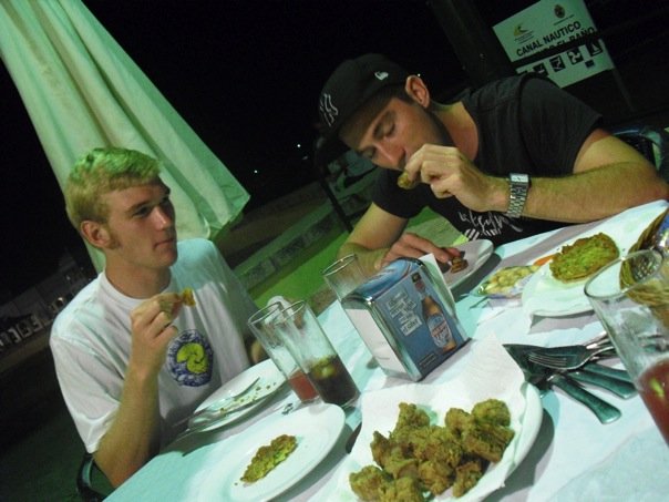 Fr my personal image I chose a scene shot in Cadiz. On a linguistic level there isn’t much to see, and advertisement for Mahou beer, a cautionary Spanish beach sign in the foreground, both of which suggest somewhere foreign, and the symbols on my clothing which are more familiar showing that I am a foreigner. The denoted message is fairly simple, two people out to eat. There is a beach in the background, drinks and various food items scattered about the table. The connoted message is a bit harder to decipher. At first glance it appears to be another meal at a restaurant, however the food items are foreign and the person to my left is staring at me intently as I take a bite of chiparones (fried mini squids). Items about the table are left unfinished and the man in white has yet to try his piece. This is a meal of firsts. There is a subtle smirk on his face as I bite down and my eyes are closed implying that what I am eating could potentially be hilarious for everyone else and horrible for me. Turns out that chiparones are quite good, except mine which happened to be rotten and disgusting, but as seen in the photo, despite the putrid taste in my mouth, I tried to keep a blank face so as not to offend my Spanish friends who have just purchased their favorite meal for me.